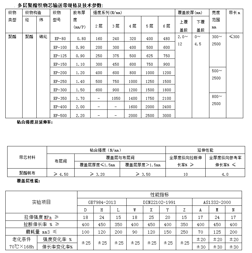 聚酯輸送帶又稱EP輸送帶,其骨架材料為經(jīng)向滌綸、緯向錦綸交織而成的聚酯帆布,其性能特點(diǎn)是經(jīng)向的低延伸率和緯向的優(yōu)良成槽性能,耐水性好,濕態(tài)強(qiáng)度不下降,不發(fā)生霉變,初始模量高,適用于中長(zhǎng)距離較高載重、高速條件下輸送物料。